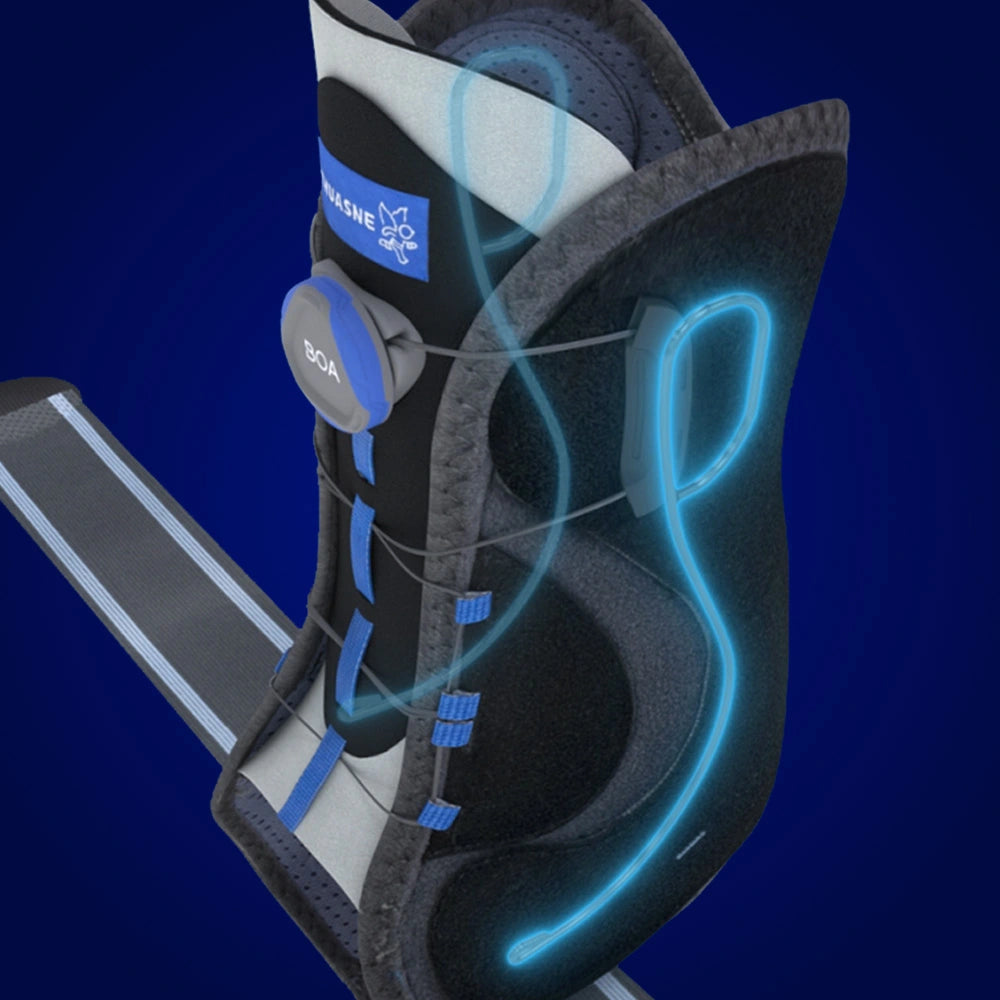 Glisser le pied dans la chevillère, s’assurer que le talon repose sur la zone prévue à cet effet. Resserrer avec le système de serrage Boa® : appuyer sur la molette jusqu’au «clic», la tourner dans le sens des aiguilles d’une montre jusqu’à obtenir le maintien suffisant. Croiser les sangles au-dessus du pied, contourner la cheville et les croiser à nouveau derrière la cheville avant de les fixer. Pour desserrer le système: tirer sur la molette jusqu’au «clic» pour relâcher les lacets. Il est recommandé que le port du produit se fasse dans une chaussure de sport fermée lors de la pratique du sport, et la nuit en protection afin de limiter et d’éviter les mouvements brusques.